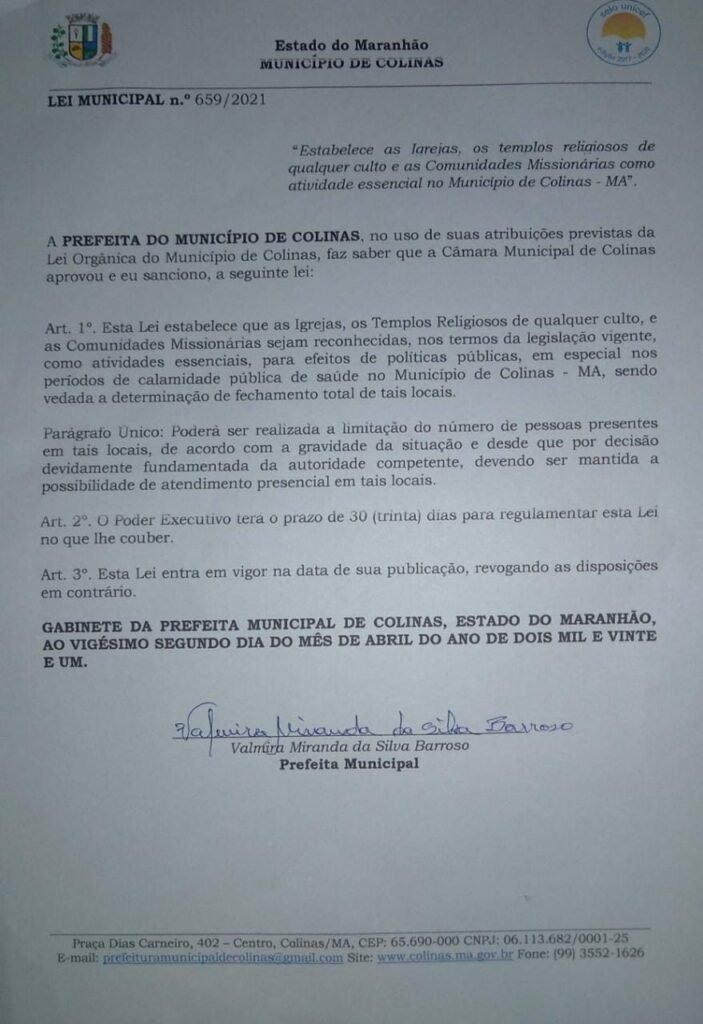 LEI MUNICIPAL RECONHECE AS IGREJAS, OS TEMPLOS RELIGIOSOS DE QUALQUER CULTO E AS COMUNIDADES MISSIONÁRIOS COMO ATIVIDADE ESSENCIAL NESTE PERÍODO DE PANDEMIA EM COLINAS