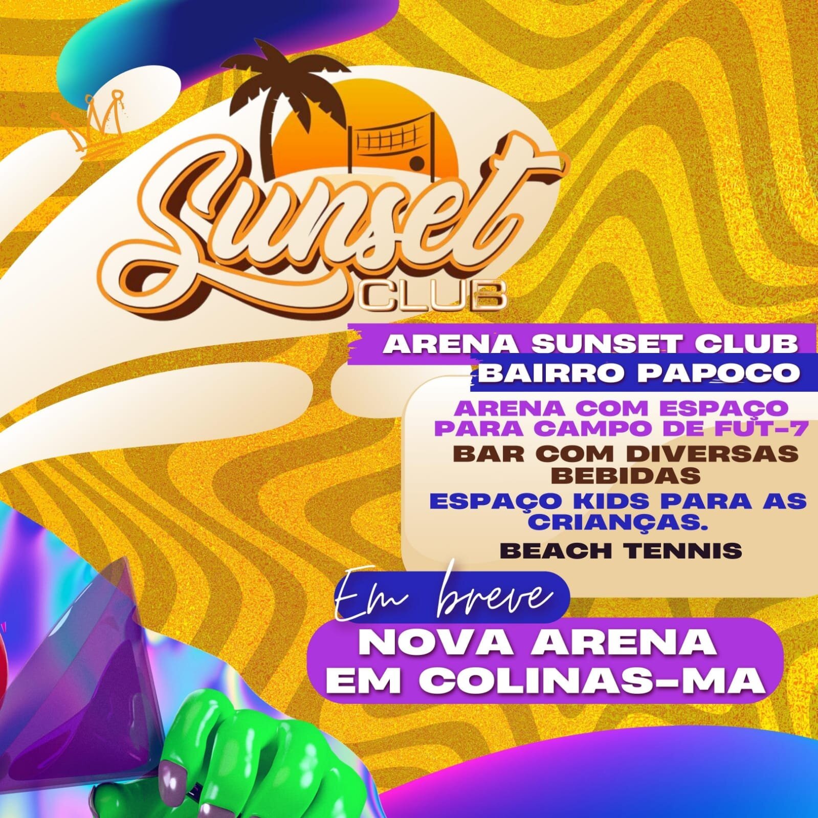 Uma das grandes novidades será o mais novo espaço para desenvolver o Beach Tennis, que é uma febre em Estados do Sudeste do País. Antes de mais nada, é importante lembrar que o Beach Tennis, fortalece a musculatura do corpo e melhora o condicionamento físico das pessoas. Além disso, a Arena Sunset Club possuirá campo para futebol Society Fut-7, com um gramado sintético de última geração e espaço para prática de vôlei de praia e mais um Pub contendo todas as bebidas e vitaminas disponíveis no mercado para melhor atender aos seus clientes. O horário de funcionamento será de segunda-feira à domingo, das 16:00 às 00:00.