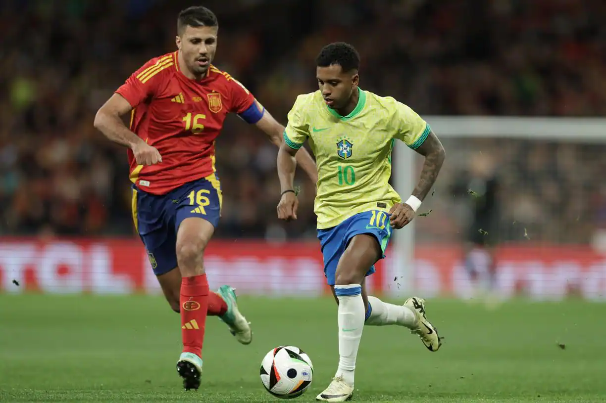 Gols: Rodri, 12’/1ºT (1-0); Dani Olmo, 35’/1ºT (2-0); Rodrygo, 38’/1ºT (2-1); Endrick, 4’/2ºT (2-2); Rodri, 41’/2ºT (3-2); Paquetá, aos 50’/2ºT (3-3).