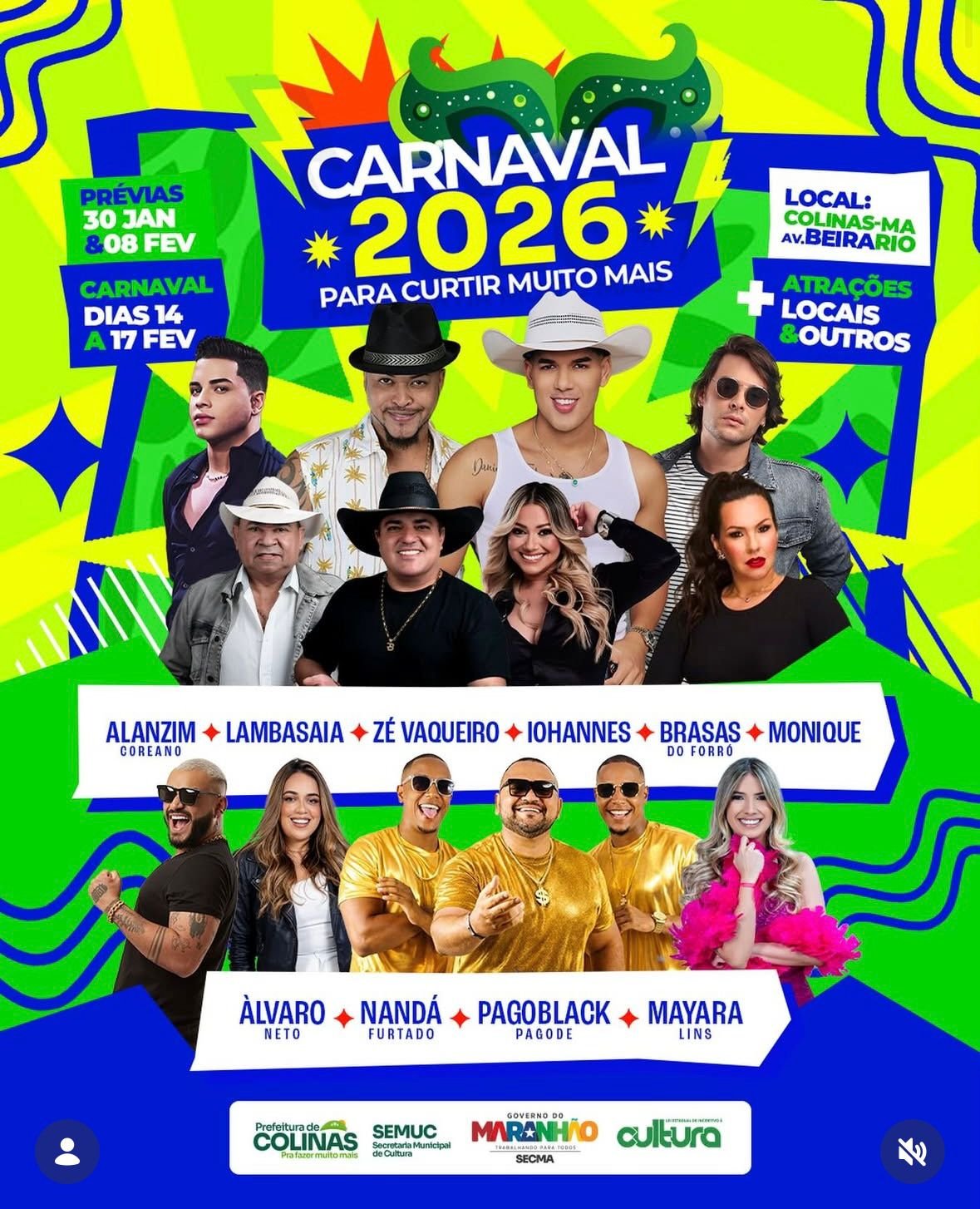 A realização é da Prefeitura Municipal de Colinas, por meio da Secretaria Municipal de Cultura (SEMUC), com apoio do Governo do Maranhão e da Secretaria de Estado da Cultura (SECMA). A expectativa é que o Carnaval movimente significativamente a economia local, impulsionando setores como comércio, turismo, hotelaria e serviços.