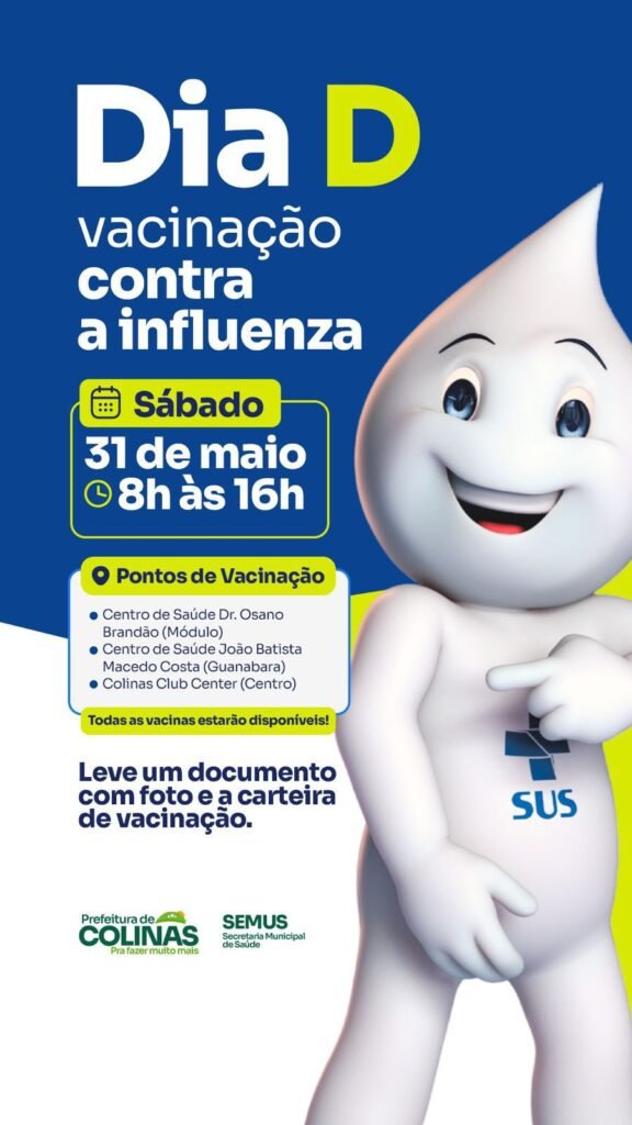 A Prefeitura de Colinas, por meio da Secretaria Municipal de Saúde (SEMUS), vai promover neste sábado, dia 31 de maio, o Dia D de vacinação
